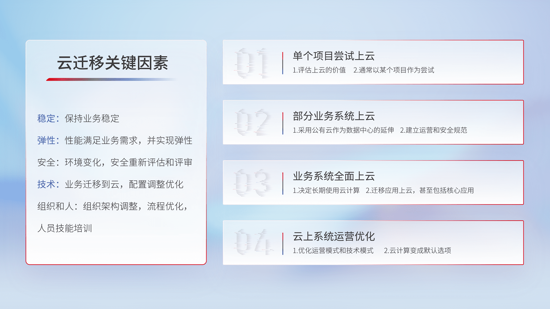 结合实际业务,,,,从规划设计、、、、云平台选型、、云原生改造、、数据迁移、、集成交付,,,迁移全过程为客户识别最佳上云路径,,,,做好风险识别管理,,,,设计网络架构、、、身份权限、、、、安全审计合规、、、操作审计、、日志审计、、、监控告警策略、、、、多站点容灾设计等,,,,对云上基础设施进行整体规划,,提升IT治理水平,,,,以满足弹性、、、、高可用、、、高性能的需求。。。。