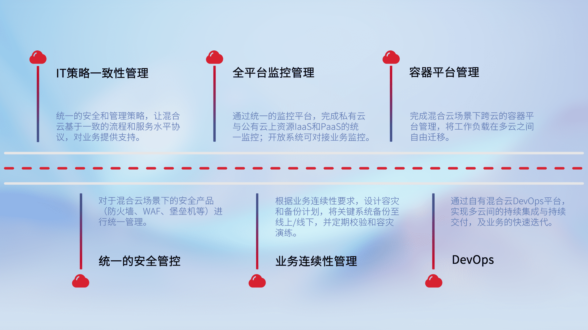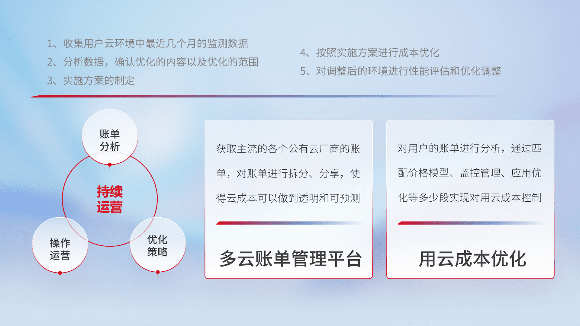通过多云纳管,,,,以统一的资源数据模型把客户的云资源进行抽象和封装,,进而实现对多云资源的统一操作,,,,保障云资源管理的可靠性、、稳定性与可用性。。量身定制化运维内容,,,配置、、、、开发运维、、、补丁管理、、、、备份、、、监控、、认证和访问管理、、审计和日常巡检等,,,保障在用云过程中的可靠度,,,稳定度以及高可用率。。。