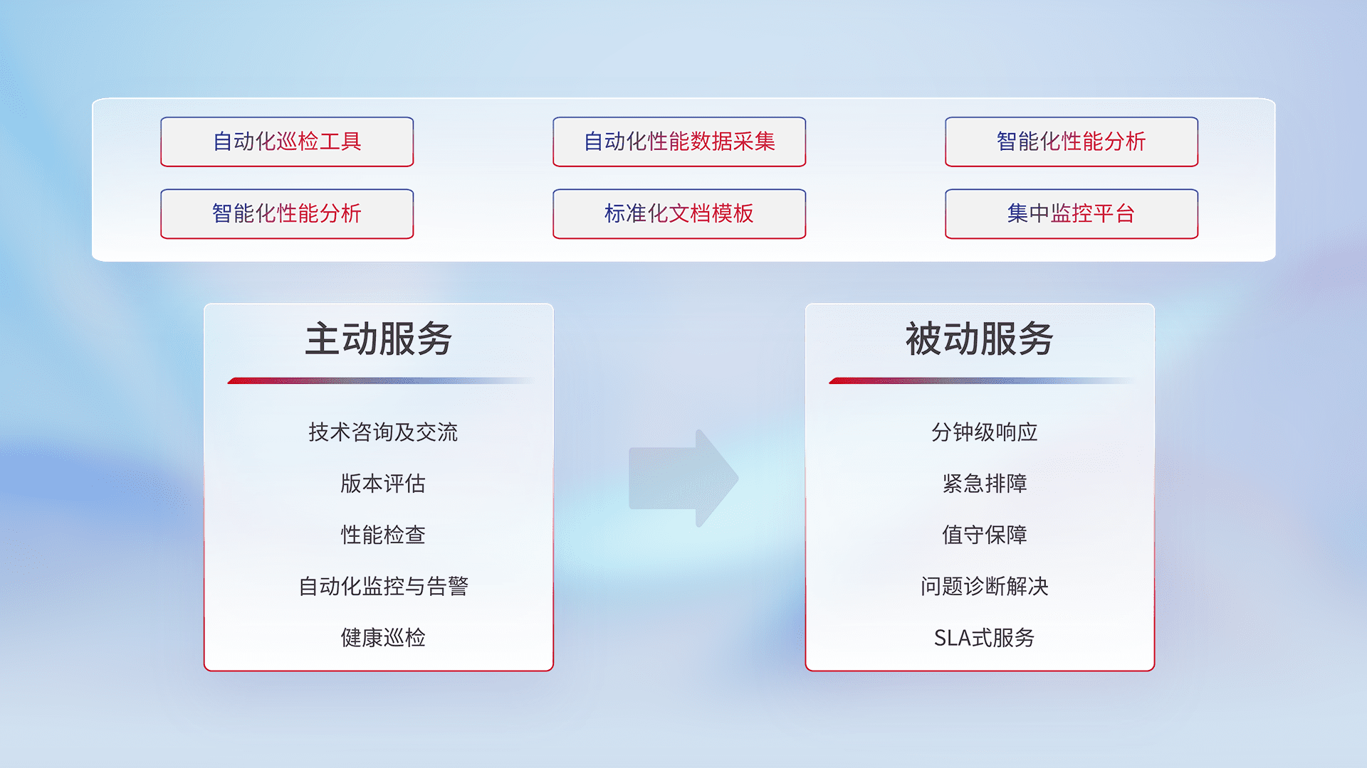 智能化工具和标准化文档,,保障服务质量,,,提供主动服务(包含技术咨询、、、、版本评估、、、、性能检查、、、自动化监控与告警、、、健康巡检)和被动服务包含(分钟级响应、、、紧急排障、、、值守保障、、、、问题诊断解决、、SLA服务)。。。